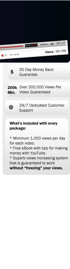 Q: How Does the Buying / Purchasing Process Work? A: To purchase our application, we've done our best to make it as simple and secure as possible - Just go to the purchase page, and click on the appropriate "Buy Now" button. Note that at the moment we are accepting payment through PayPal and all major Credit/Debit cards (with a 30 day money back guarantee). The whole process is simple and easy, so after you've completed the purchase, you'll receive an instant email from us, asking you to send us back a list of videos that need to have their views "boosted", after which in less than a day your videos will be added to our system, meaning they'll start to receive the purchased amount of views.