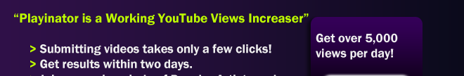Q: How Does Increasing Views Help Me? A: Playinator (since version 4.0), instead of using proxy servers and simulations of real user behavior, now uses a wide network of users and computers - these "users" are send to your videos everyday, meaning YouTube actually sees increased activity in your video clips, and thus with every new view, it increases the number of views your video has. Make enough views, and you'll be heading for the #1 spot on the YouTube search pages in no time! So what happens next when you reach the first page? Well, depending on your selection of tags, your videos may be subject to a lot of REAL everyday visits from hundreds of new visitors, and if you have your web site links included (be it in the description box or if they are embed in the video) that means a lot of FREE TARGETED traffic to your web site, everyday! Another great possibility is that since your videos will be on the first places on YouTube (meaning they will be seen by a lot of new people everyday), this means that using Playinator is a great opportunity to promote your band, music, products, ideas, events or anything else. Also, you can check our secondary Product (called "The YouTube Income Generation eBook) which is especially targeted at learning how to make money with YouTube, and gain channel popularity.